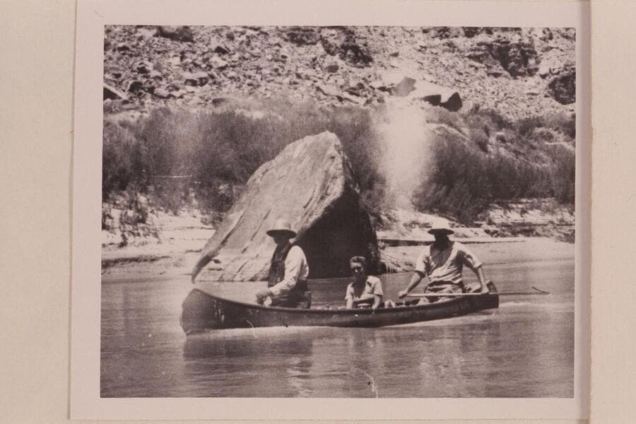 Bishop W. R. McConkie and Wayne McConkie in their canoe below the Junction in Cataract Canyon. Doris Nevills is riding as passenger