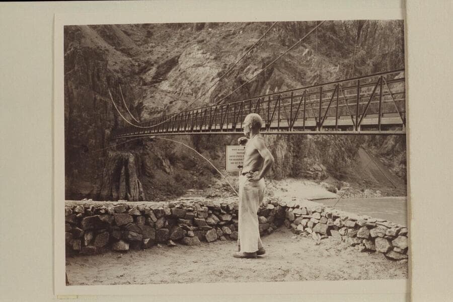 Margaret Marston crosses suspension bridge to right bank. Bright Angel Creek