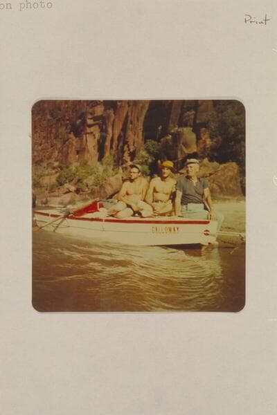 Lug Larsen, AK Reynolds, and Marston on the "Galloway." Beach on right bank below Hells Half Mile; Lodore Canyon