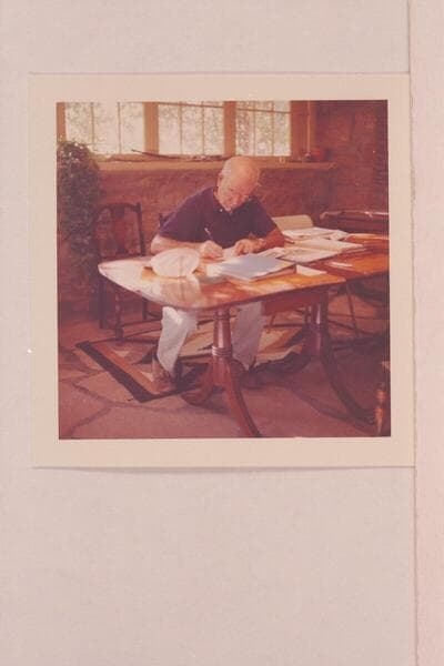 Dock Marston writes the notes of the trip near Navajo Mountain; dining room of Navajo Mountain Trading Post