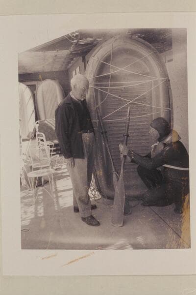 Dock Marston and Bill Belknap with Sportyak used in 1964 transit of Cataract Canyon. News photo with Polaroid camera