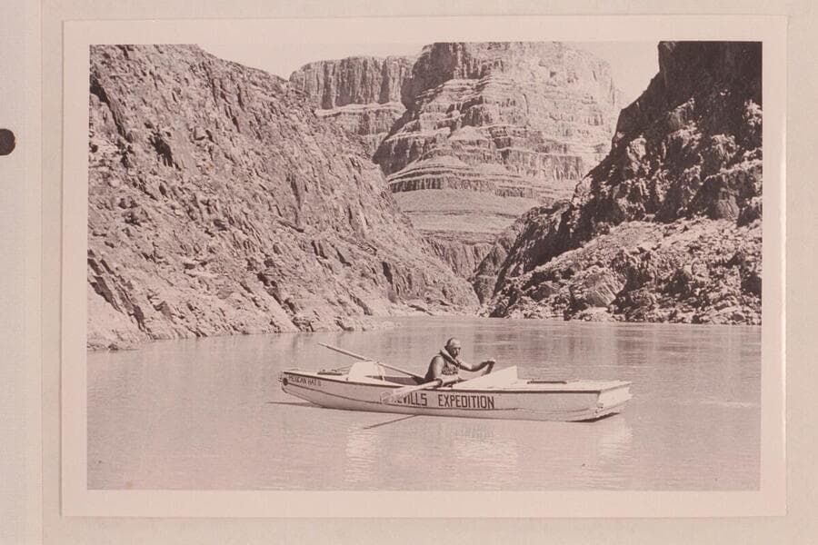Frank Masland, Jr., on head of Lake Mead near Bureau of Reclamation camp at Bridge Canyon City