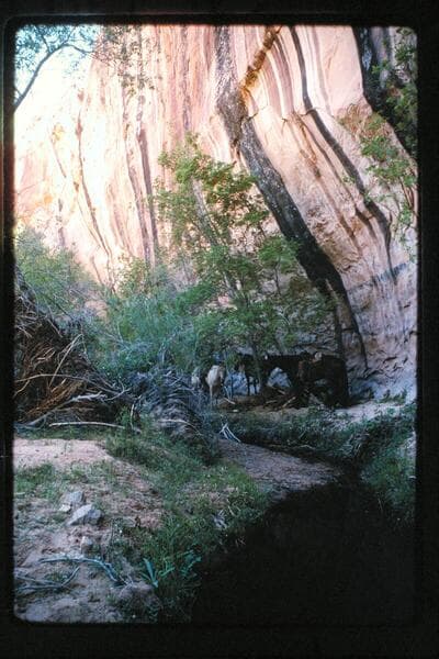 Lunch under overhang in tributary of Halls Creek below Baker Ranch