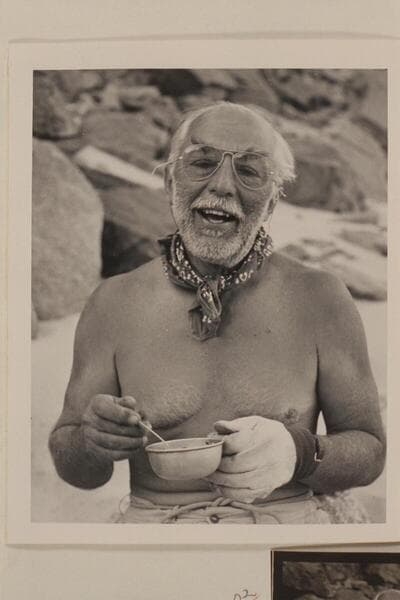 Frank E. Masland, "Fisheyes," takes care of a hot cup of coffee. Grand Canyon traverse of 1954, June. Diamond Creek