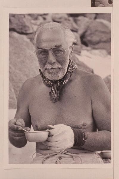 Frank E. Masland, "Fisheyes," takes care of a hot cup of coffee. Grand Canyon traverse of 1954, June. Diamond Creek