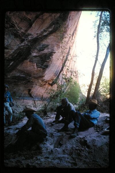 Lunch under overhang in tributary of Halls Creek below Baker Ranch