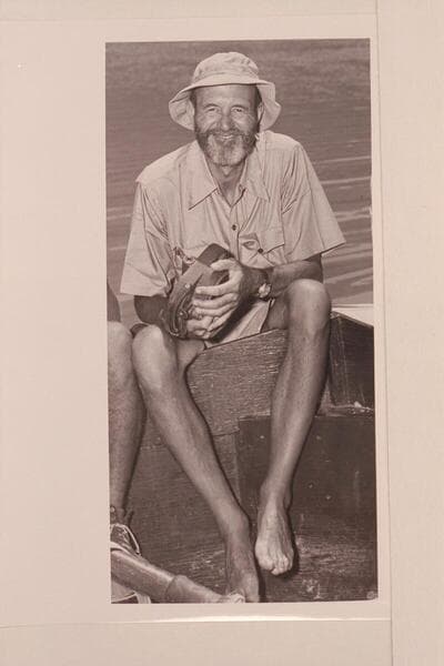 John Mull at wheel of Jordan's outboard boat on upper Lake Mead