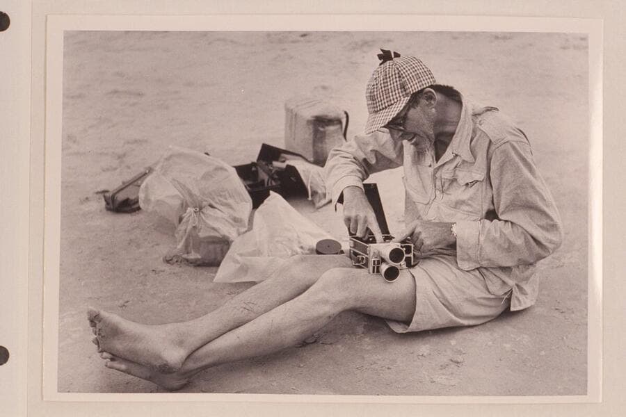Evie and John Mull at end of motor run of 1952, May. John winds his camera with pliers