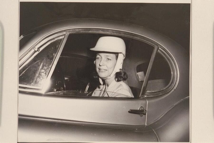 Evie Mull (Mrs. John Barnes Mull). "The helmeted Juno is in real life Evie having pre-race jitters at the start at Thompson, Connecticut, last summer." (letter of John Mull, 1954, Mar. 23)