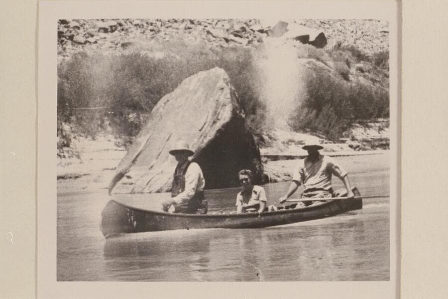 Bishop W. R. McConkie and Wayne McConkie in their canoe below the Junction in Cataract Canyon. Doris Nevills is riding as passenger