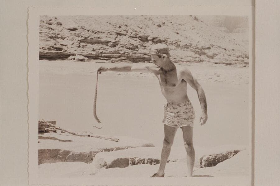 Garth Marston watches Norm Nevills stretch away from a rattler found at the mouth of the Little Colorado River