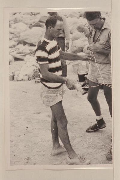 Norm Nevills working on puzzles at Diamond Creek in Grand Canyon during his 6th traverse. John Doerr at right