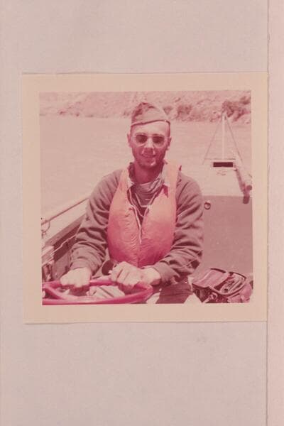 Ed Hudson, posed at wheel of "Finally" used in run from Fruita to Lees Ferry