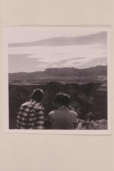 Susie Reilly sits at the edge of Marble Canyon looking down at Badger Creek Rapid. Pat Reilly prepares for photography