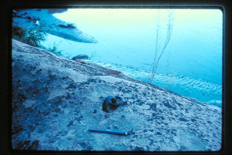 Ring bolt on boulder at Halls Crossing, left bank, Glen Canyon
