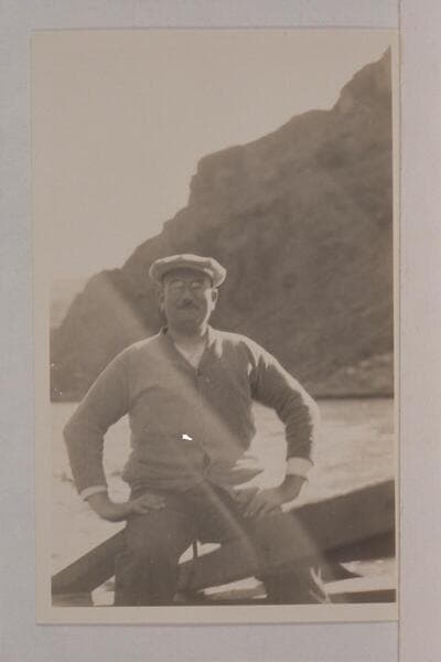 Adolph Sutro sitting on the sweep of the Hyde scow