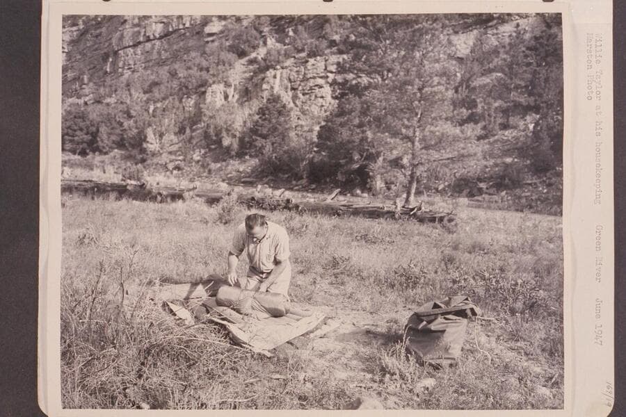 Willie Taylor at end of Green River run in 1947, July. Jensen, Utah. End of his first River trip
