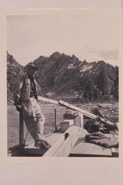 Willie Taylor on Don Smith's Salmon River sweep-scow. Shoup, Idaho