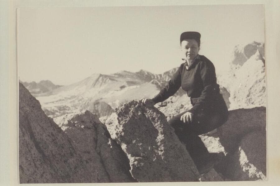 Freda M. Walbrecht, Los Angeles. On Mt. Starr in the Sierra Nevada. Miss Walbrecht traveled from Lees Ferry to Navajo Canyon in Art Greene's boat. In 1955 she was with Georgie White from Bright Angel Creek to Temple Bar