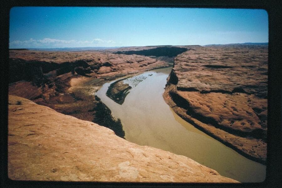Lake Powell filling; Iron Rock Island; horses on rim; Mile 109.75