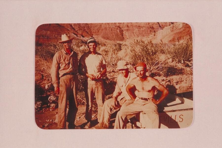 Boatmen of the Nevills San Juan party which left Mexican Hat in 1948, May 19. L to R: Frank Wright, George Wing, Ben Hess and Nevills
