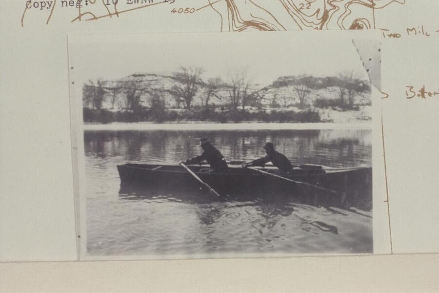 Edwin T. Wolverton and his son, Norville, on the Green River in a skiff built at his home in Green River, Utah, by Edwin T. Wolverton