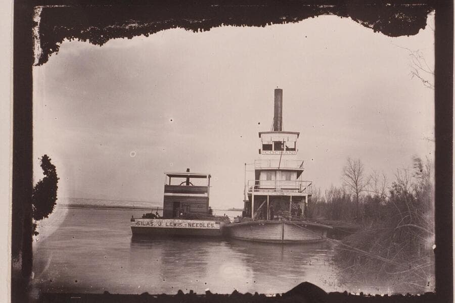 The steamer "Cochan" and the barge "Silas J. Lewis" moored to the river bank at the Yuma custom house