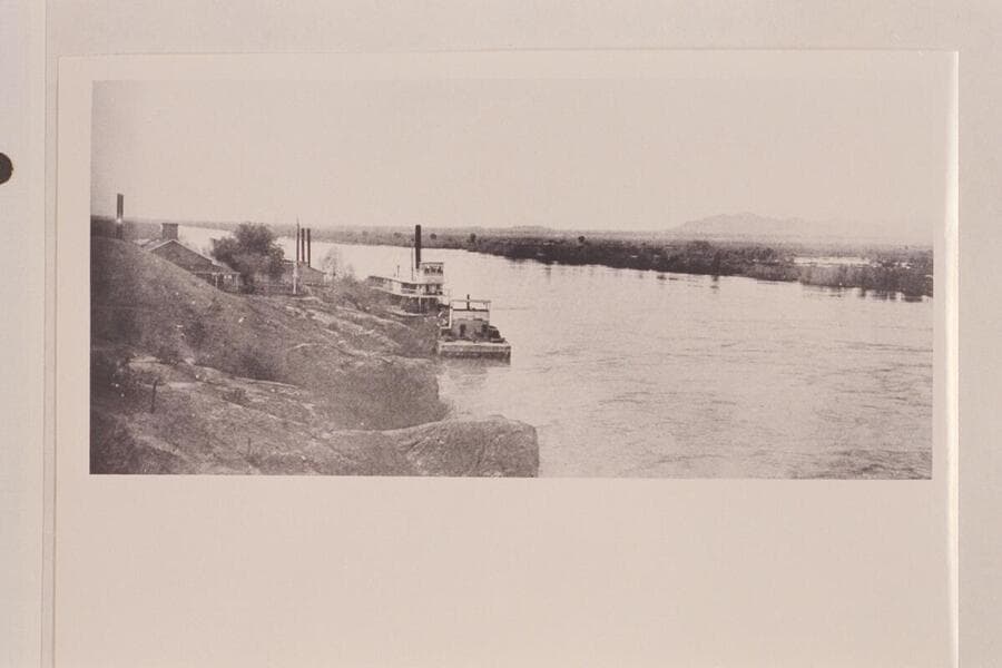 The steamer "Cochan" and the barge "Silas J. Lewis" moored to the river bank at the Yuma custom house