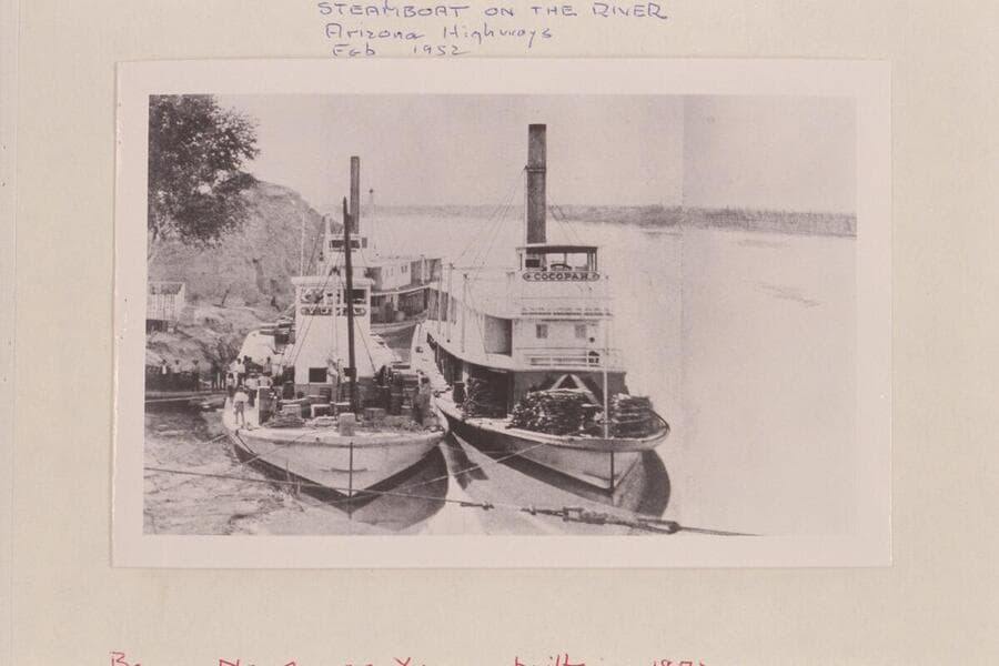The steamer "Cochan" and the barge "Silas J. Lewis" moored to the river bank at the Yuma custom house