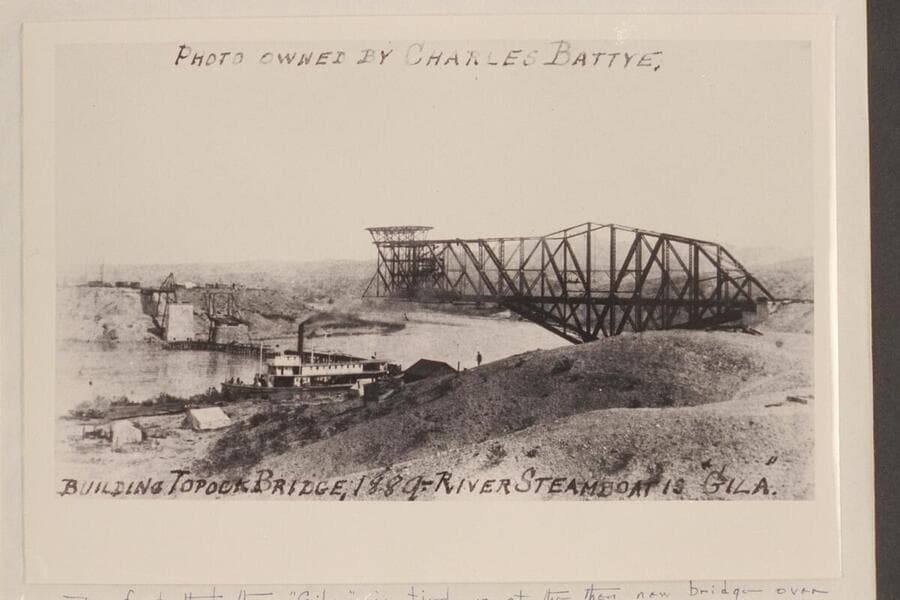 Building Topock Bridge. River steamboat is the "GILA"