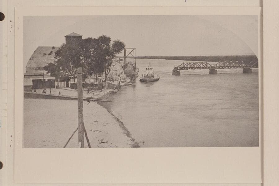 Southern Pacific rail bridge at Yuma. The "GILA" is moored at the bank above the bridge