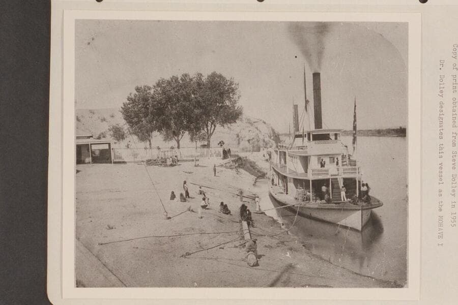 "Mohave" (I) (?) This photograph shows steamboat landing and ferry at Fort Yuma. Note the stage coach at lower left