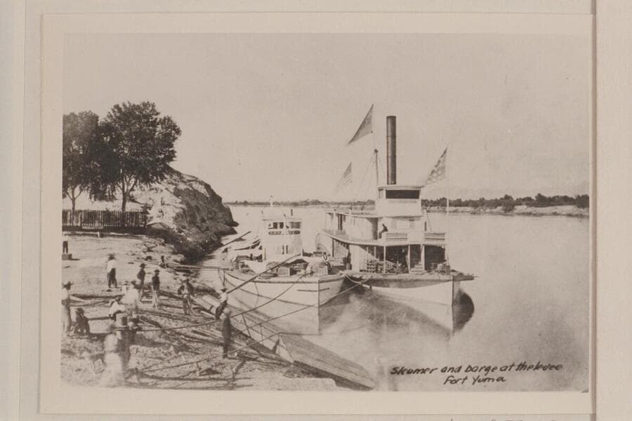 The steamer "Cochan" and the barge "Silas J. Lewis" moored to the river bank at the Yuma custom house