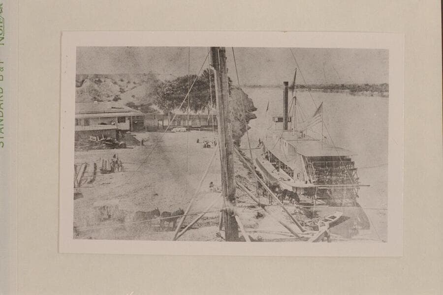 "Mohave" (I) (?) This photograph shows steamboat landing and ferry at Fort Yuma. Note the stage coach at lower left