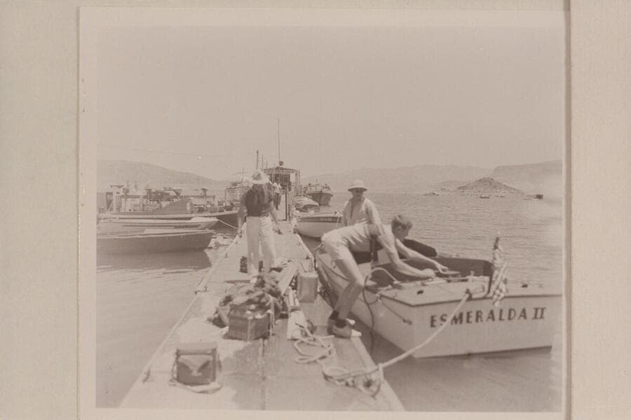 Loading the "Esmeralda" [II] at Boat Dock, Boulder City. Marston stands on the dock; Ed Hudson watches Edward Hudson