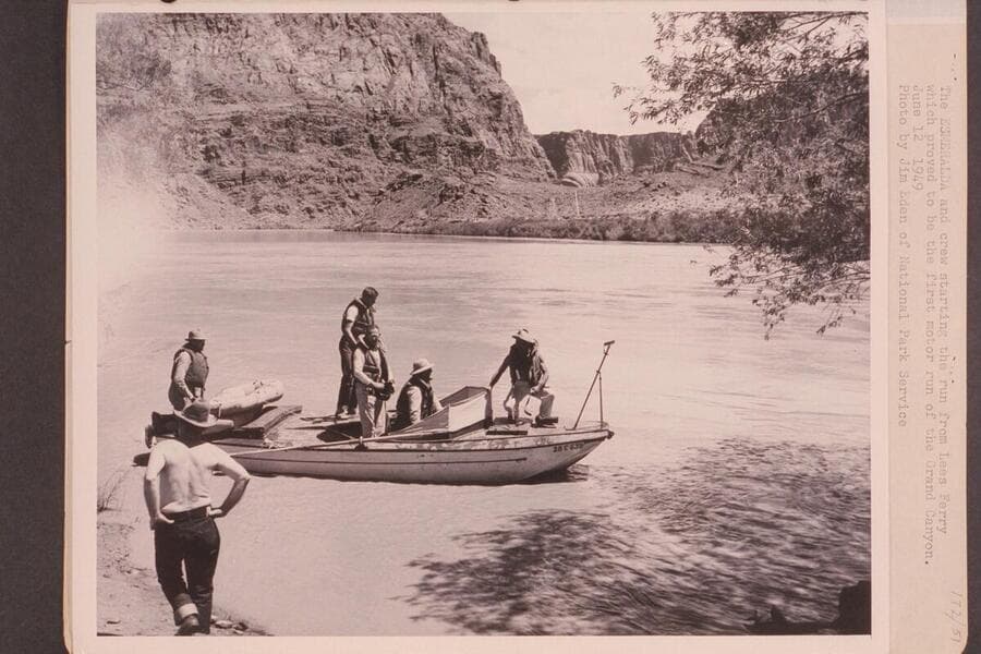 The "Esmeralda" [II] and crew starting the run from Lees Ferry which proved to be the first motor run of the Grand Canyon. Owen Clark at left with back to camera. Bestor Robinson; Edward Hudson; Willie Taylor; Ed Hudson; Dock Marston