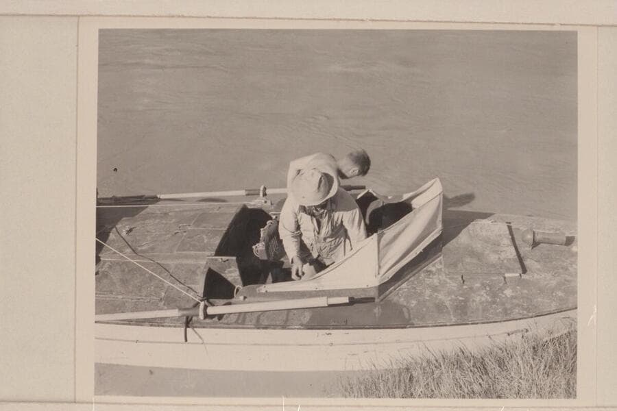 Marston and Ed Hudson make preparations for third day of cruise on the "Esmeralda"; foot of Tanner Trail