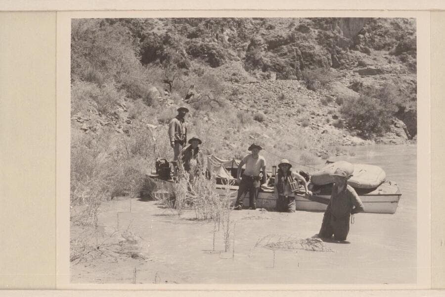 The "Esmeralda II" and her crew at Bright Angel Creek: Willie Taylor, Dock Marston, Edward Hudson, Ed Hudson and Bestor Robinson
