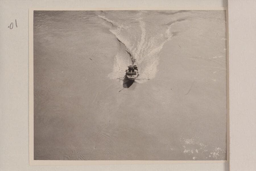The "Esmeralda II" under the suspension bridge at Bright Angel Creek. The water patterns illustrate the drag which kept the speed so low