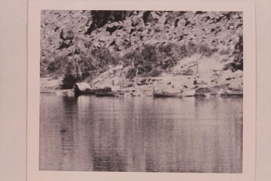 Camp of the LaRue Glen Canyon party at Lees Ferry. Note the hull of the "Navajo" at left center