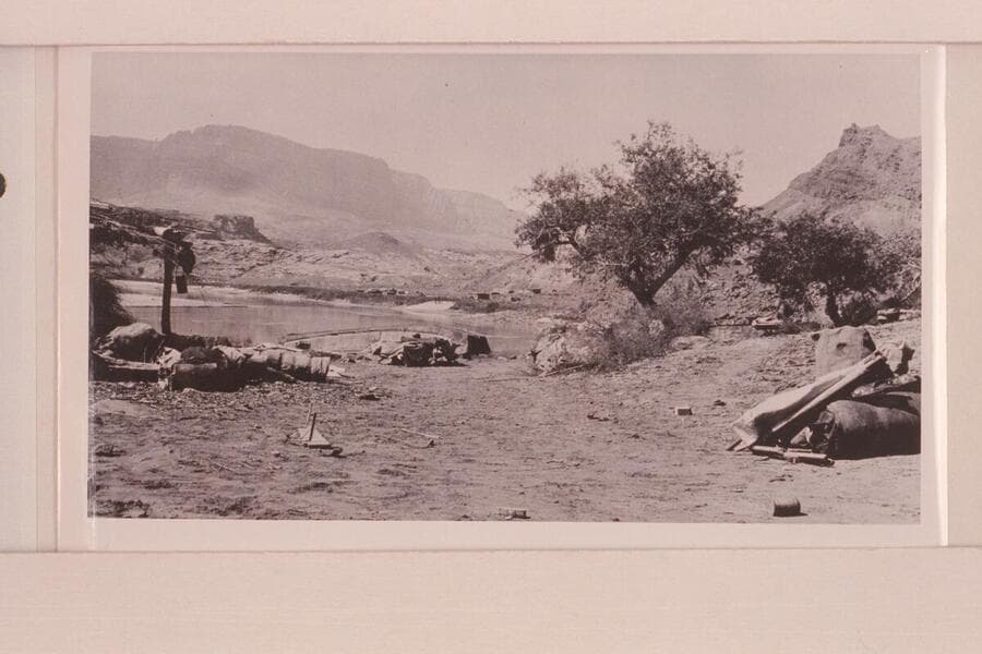 Camp of the LaRue Glen Canyon party at Lees Ferry. Note the hull of the "Navajo" at left center