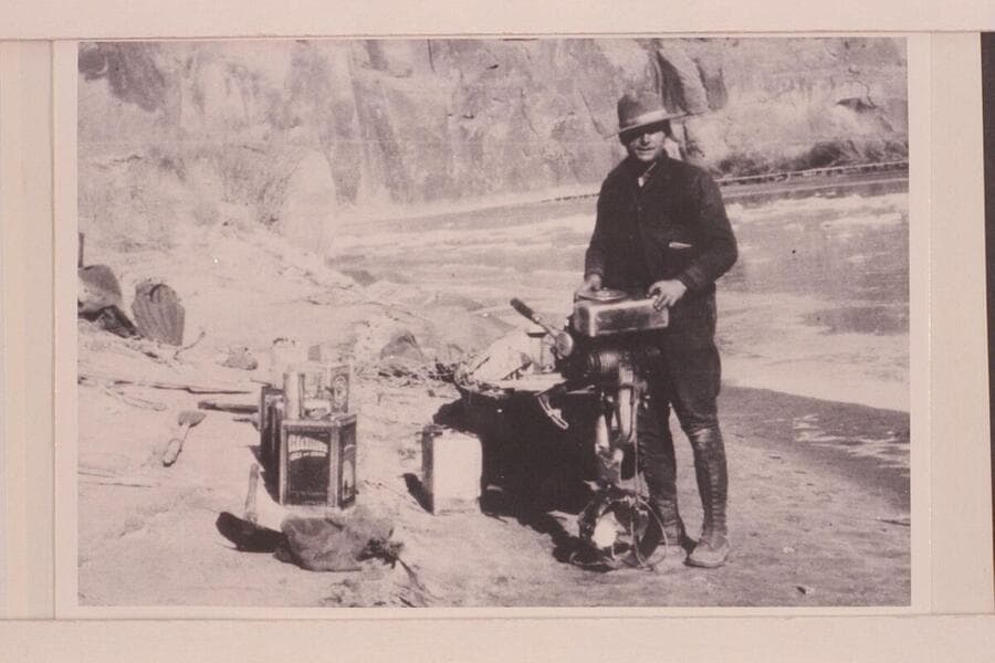 Pat Flattum and the Indian motor used in outboard trip in Glen Canyon
