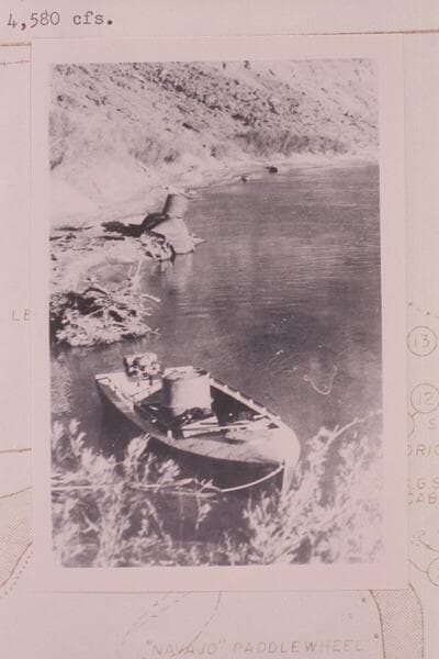 Outboard motorboat "Mallard" and the boiler of the steamer "Charles H. Spencer"; Lees Ferry