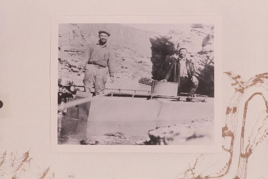 Neil Johnson and Andy Samsky in outboard motorboat "Mallard." The motorboat was 18 ft. long and powered by a 21 HP Johnson outboard motor. Mile 98.2--98.3 in Glen Canyon