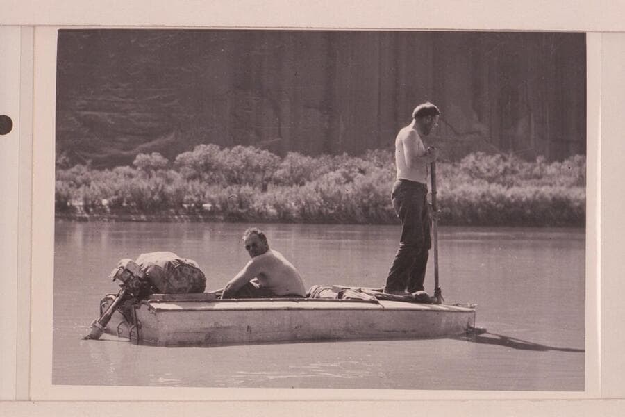 Frank Swain, Bill Chryst and Julius F. Stone in the "Amos" during traverse of Glen Canyon