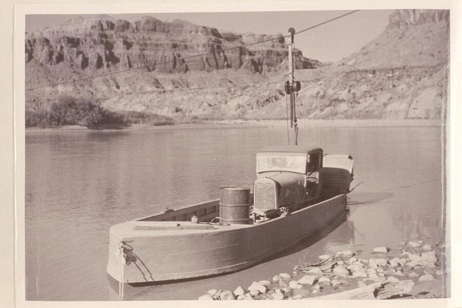 The Lincoln and Dodge Power Wagon on Chaffin Ferry in Hite, Utah