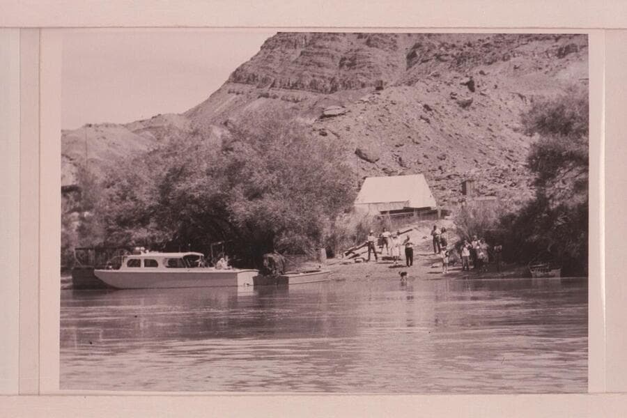 Motorboats at Lees Ferry. Higgins boat of Bureau of Reclamation at left. Art Greene's air prop boat at center