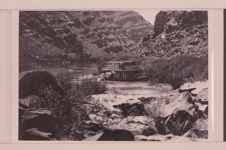 The motorboat "City of Moab" tied to the bank of the Grand River above the Junction after failing to make passage up the rapid at the Slide