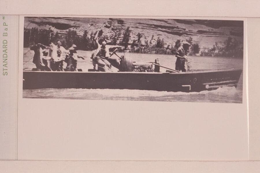 Motor of boat before cabin was added to close it in from weather. The large scow operated on the Colorado River by the Moab Garage Company