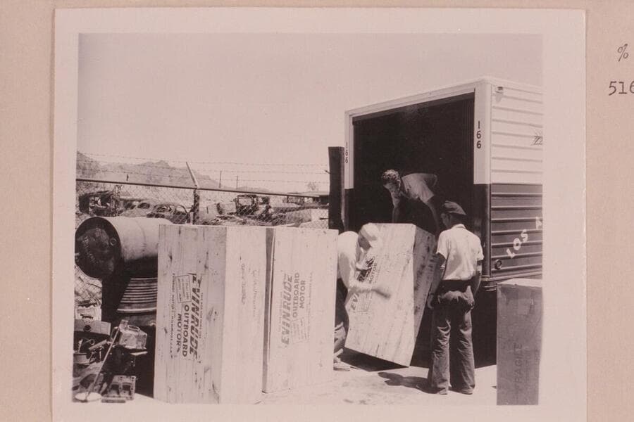 Evinrude Big Twin Outboards arrive at Boulder City. MacDonald is helping with the unloading at left as Jimmy Jordan watches the operation at the right